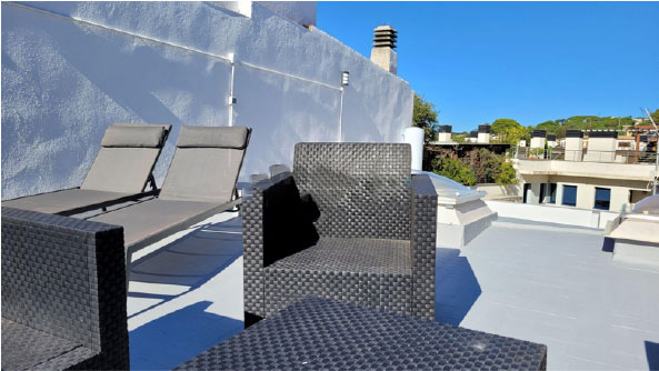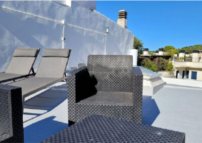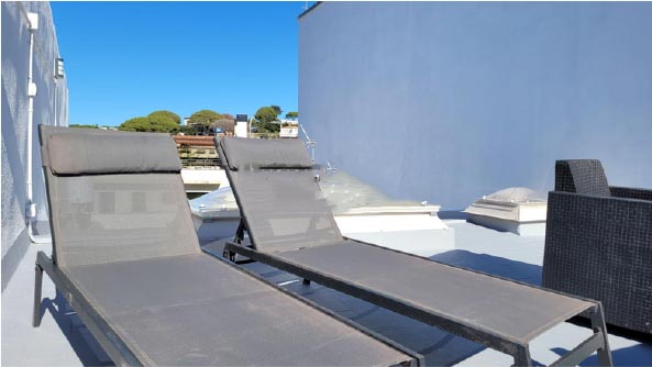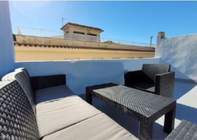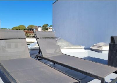 The large comfortable double bedroom can sleep 2 adults and the small bedroom up to 2 children/adults on a sofa bed. It boasts a large private south facing roof terrace solarium (55m2) that allows you to enjoy sunny carefree days, as you can lounge around on a comfortable 5 person terrace suite, 2 loungers and coffee table and use the barbecue grill to dine ‘al fresco’. On chilly winter nights a chiminea can be lit to gently warm the patio.
