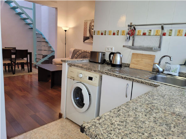 L’appartement (55m2) dispose de la climatisation/chauffage avec 2 chambres pouvant accueillir jusqu’à 4 personnes, une salle de bain, un salon/salle à manger spacieux et confortable avec une télévision à écran plat et une cuisine qui offre à ses hôtes un four, un micro-ondes, un lave-linge, grille-pain, bouilloire et réfrigérateur.